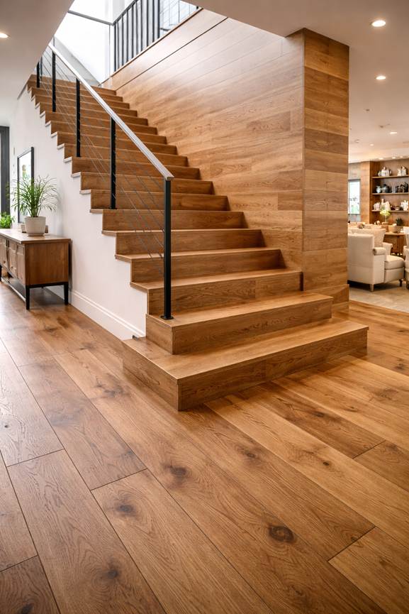 A key design trend for 2026 is Cohesive Wood Integration. Designers are moving away from contrasting trims and stairs. Instead, they are matching the flooring exactly with custom-milled stair treads, nosings, and even wall paneling. Because National Hardwood operates its own in-house mill, we are uniquely positioned to help clients achieve this perfectly synchronized look.