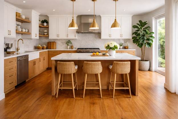 In large Los Angeles homes with high ceilings and open floor plans, light gray can sometimes look washed out. Caramel and toffee tones provide the necessary visual weight to ground a large room. These medium-brown tones offer a perfect balance—they are dark enough to feel luxurious but light enough to show off the wood’s unique grain and character.